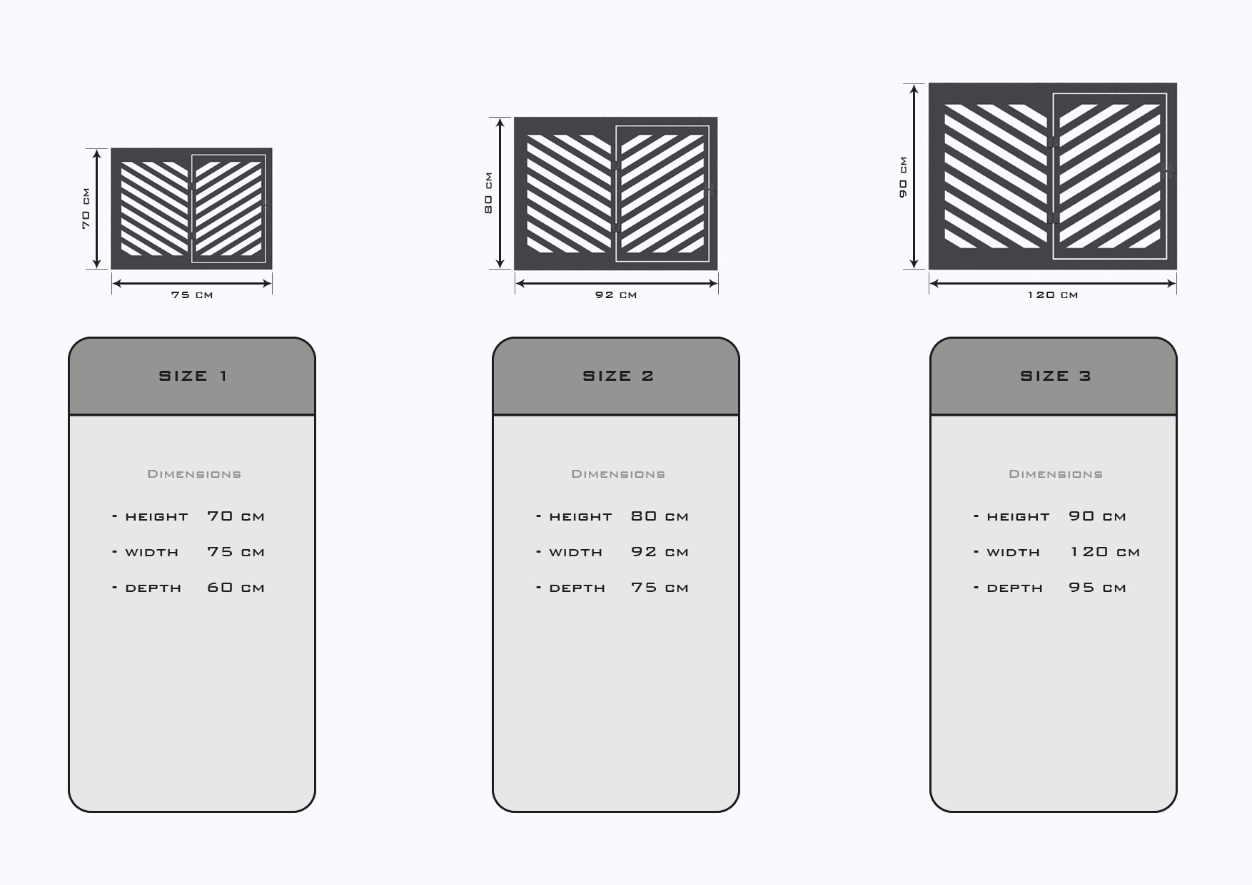 • Ürün Boyutları: Küçük Boy Yükseklik: 70 cm Genişlik: 75 cm Derinlik: 60 cm Orta Boy Yükseklik: 80 cm Genişlik: 92 cm Derinlik: 75 cm Büyük Boy Yükseklik: 90 cm Genişlik: 120 cm Derinlik: 95 cm