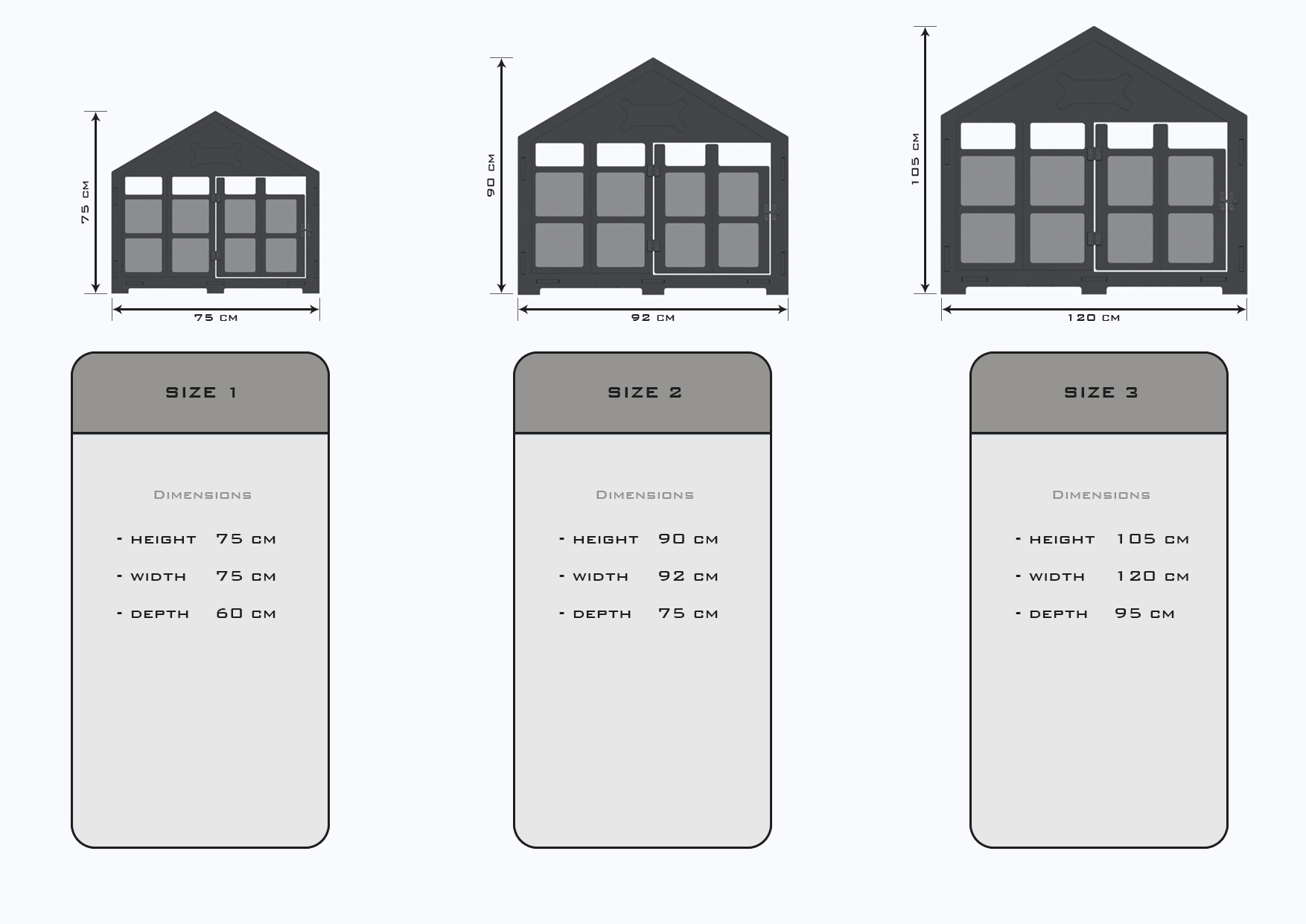 Ürün Boyutları: Standart Boy Yükseklik: 75 cm Genişlik: 75 cm Derinlik: 60 cm Orta Boy Yükseklik: 90 cm Genişlik: 92 cm Derinlik: 75 cm Büyük Boy Yükseklik: 105 cm Genişlik: 120 cm Derinlik: 95 cm