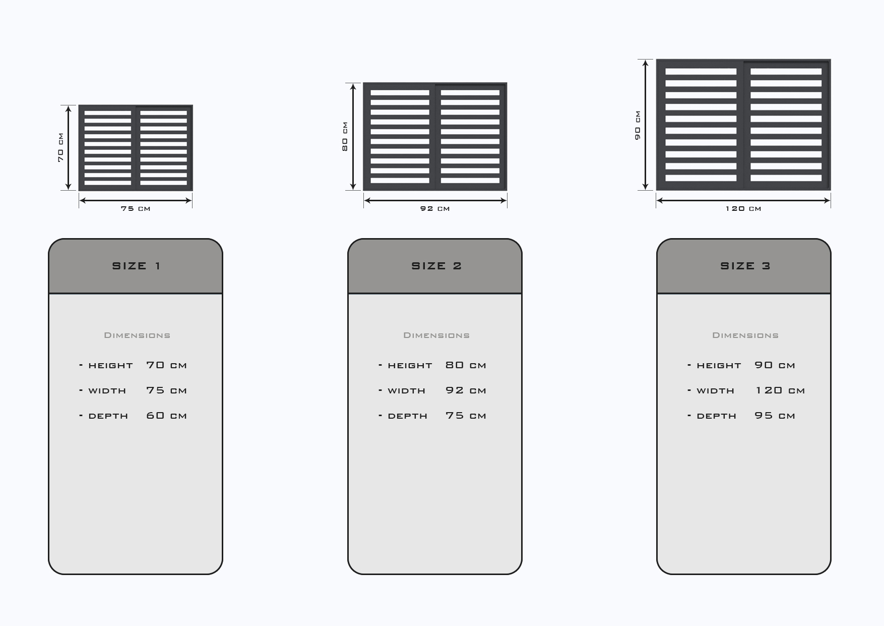 Ürün Boyutları: Küçük Boy Yükseklik: 70 cm Genişlik: 75 cm Derinlik: 60 cm Orta Boy Yükseklik: 80 cm Genişlik: 92 cm Derinlik: 75 cm Büyük Boy Yükseklik: 90 cm Genişlik: 120 cm Derinlik: 95 cm